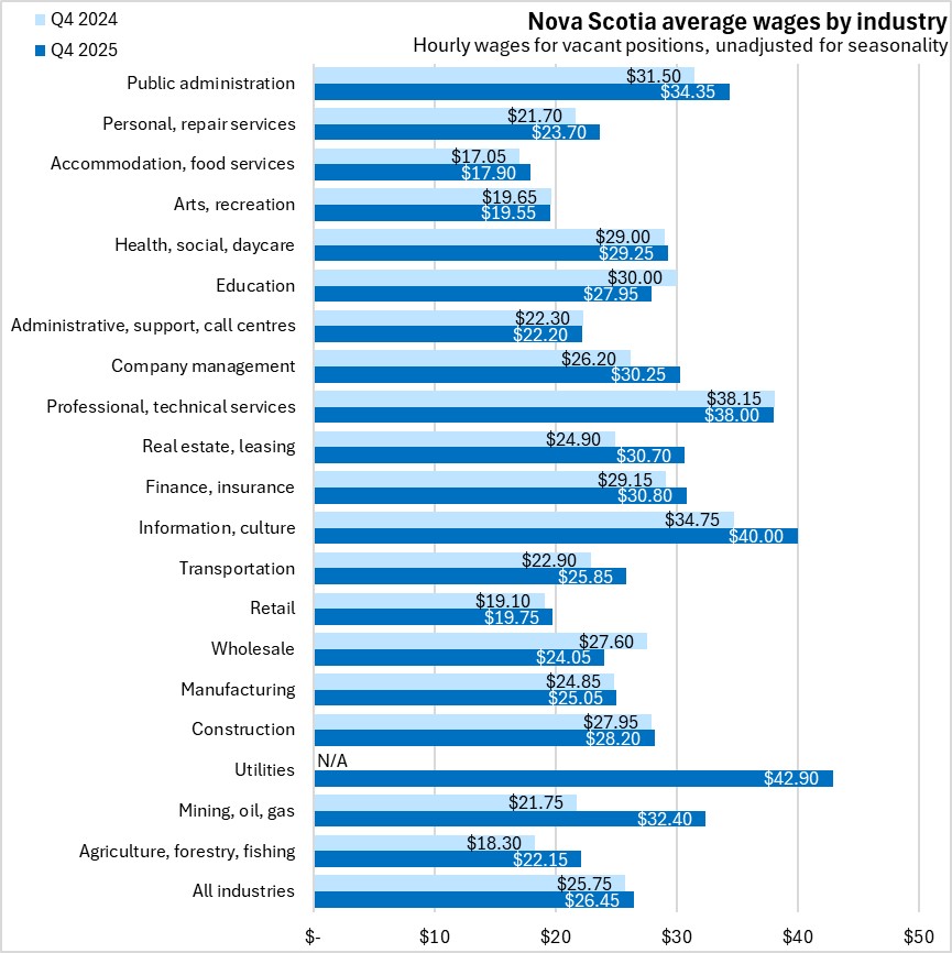 In Q4 2025, average hourly wages offered on vacant positions in Nova Scotia were highest for utilities and information/culture. Hourly wages for vacant positions in Nova Scotia were lowest for accommodation/food services.