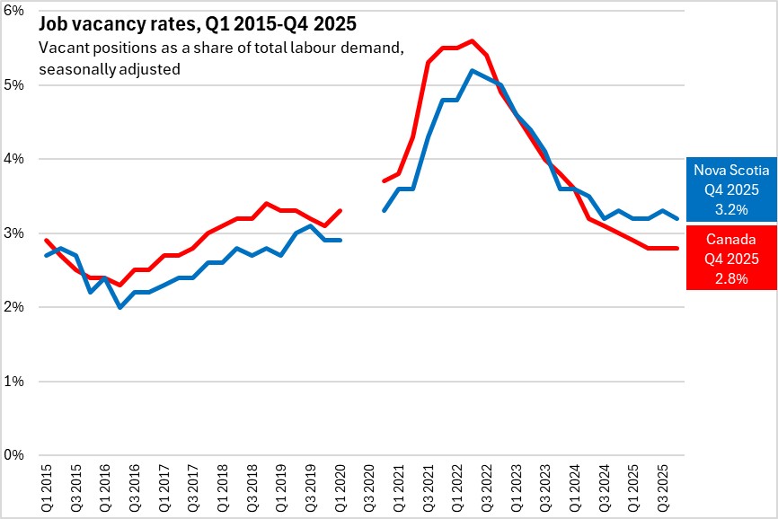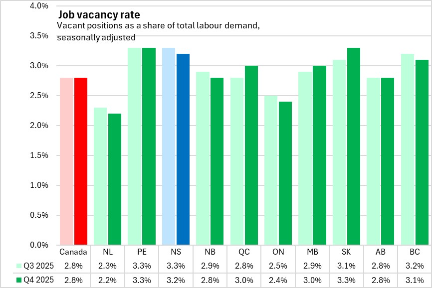 Nova Scotia's job vacancy rate (seasonally adjusted) decreased 0.1 percentage point to 3.2% in Q4 2025, representing 14,450 job vacancies.