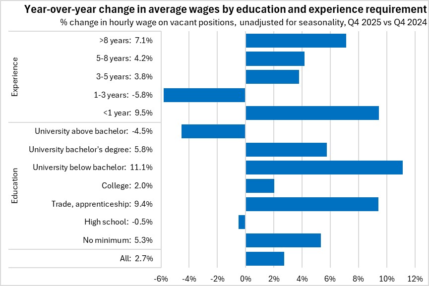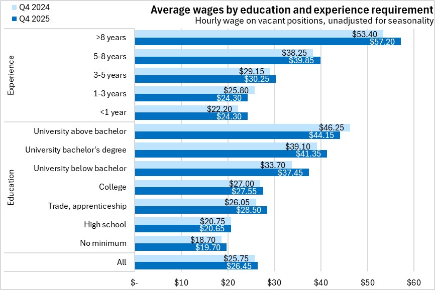 Over the last year (comparing Q4 2025 against Q4 2024), average hourly wages were up the most for positions requiring no more than one year of experience, as well as for those requiring a university below bachelor's degree. Wages were down for vacant positions requiring between 1-3 years of experience. By education requirement, average wages were down for high school requirement.