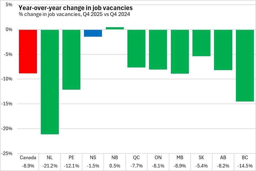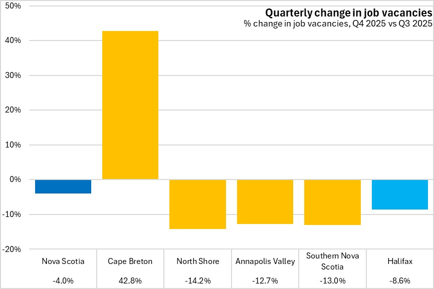 In Nova Scotia, job vacancies were down in all regions except Cape Breton. North Shore reported the largest decline in job vacancies in the fourth quarter of 2025.