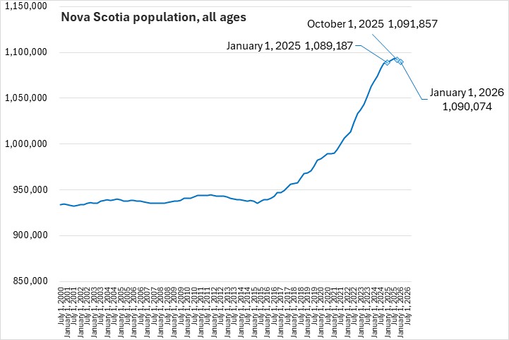 Nova Scotia's population was 1,090,074 as of January 1, 2026, a decline of 1,783 (-0.16%) from October 1, 2025.