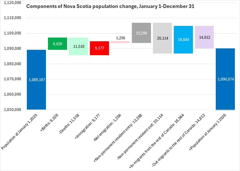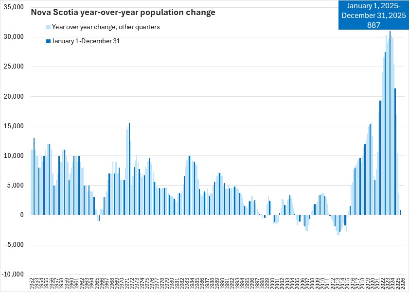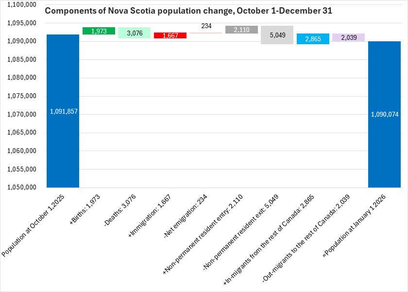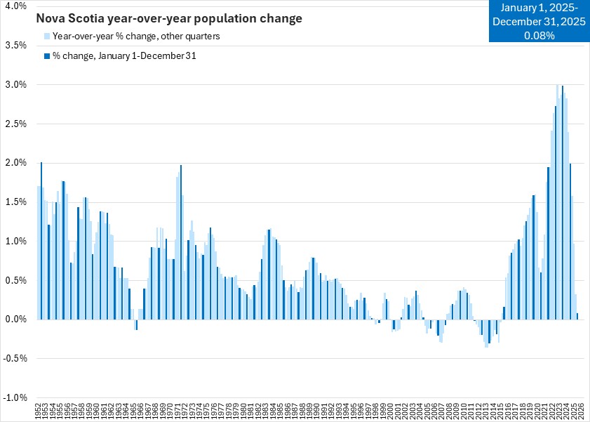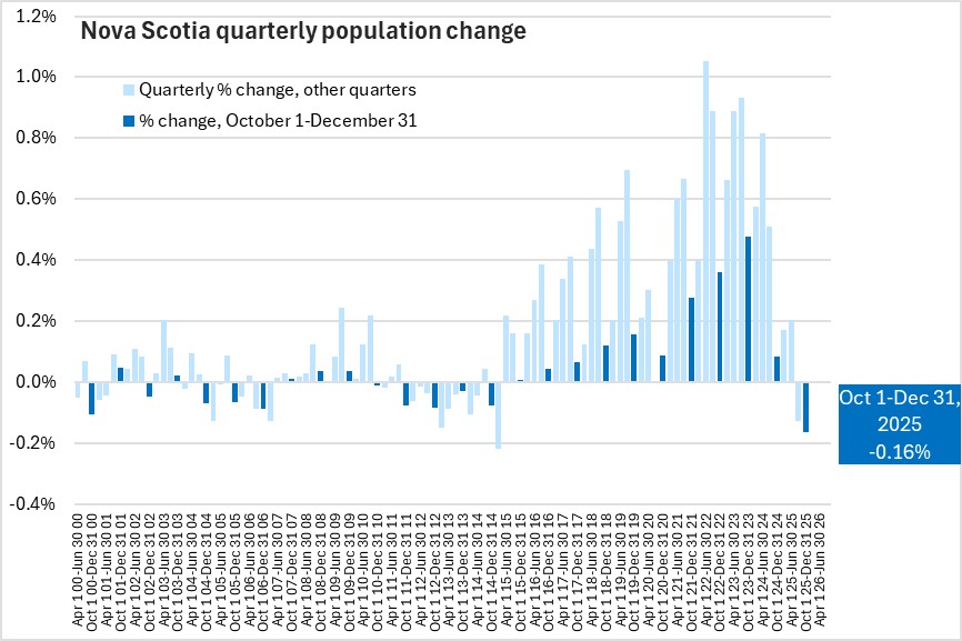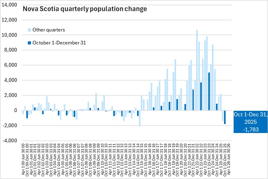 Nova Scotia's population decline of 1,783 (-0.16%) from October 1 to December 31, 2025 was the second consecutive quarterly decline. Nova Scotia last reported consecutive quarterly population declines on April 1, 2015.
