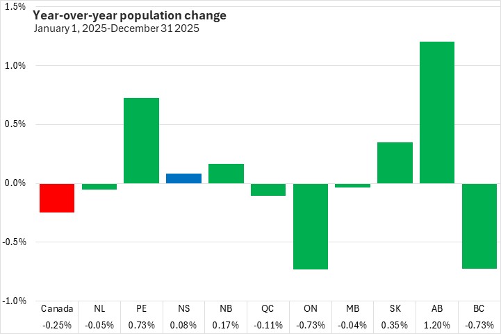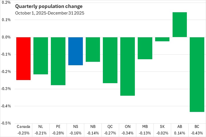 From October 1 to December 31, 2025 Nova Scotia’s population contracted by 0.16%. All provinces reported declining populations except Alberta (Saskatchewan's decline was very slight).British Columbia had the fastest population decline among provinces.