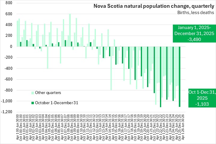 Nova Scotia’s natural population change (the number of births less the number of deaths) has been negative in every quarter since 2016. Between October 1 and December 31, 2025 there were 1,973 births and 3,076 deaths, amounting to a natural population decline of 1,103. The decline in the October-December period 2025 was somewhat larger than in the same periods of 2023 and 2024.