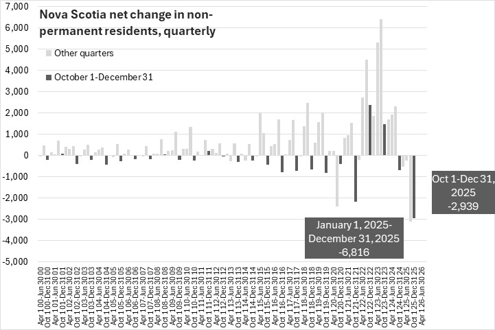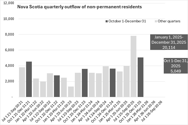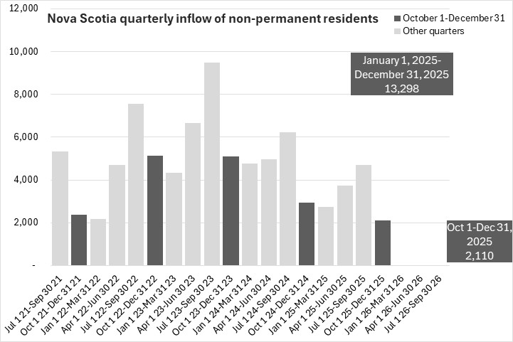 In the period January 1, 2025 to December 31, 2025 there was a net decrease of 6,816 non-permanent residents in Nova Scotia with 13,298 non-permanent resident entries and 20,114 non-permanent resident exits.