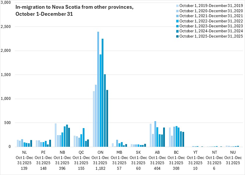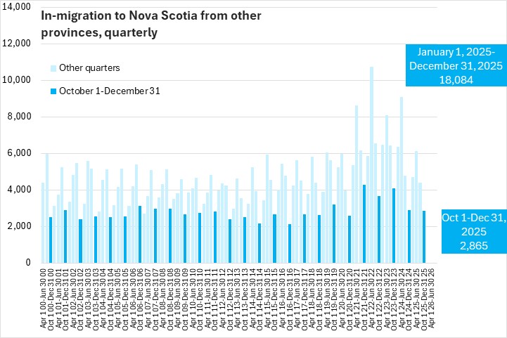 A total of 2,865 new Nova Scotians arrived in the province from other parts of Canada between October 1 to December 31, 2025. This was the slowest pace of in-migration for the same period since 2020. From January 1, 2025 to December 31, 2025, 18,084 interprovincial migrants arrived in Nova Scotia.