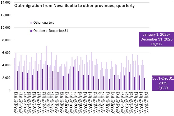 A total of 2,039 Nova Scotians left the province bound for other parts of Canada between October 1 and December 31, 2025 - a pace that has slowed since the same periods over 2021-2024. Over the past year (January 1 to December 31, 2025), Nova Scotia has seen 14,812 interprovincial outmigrants.