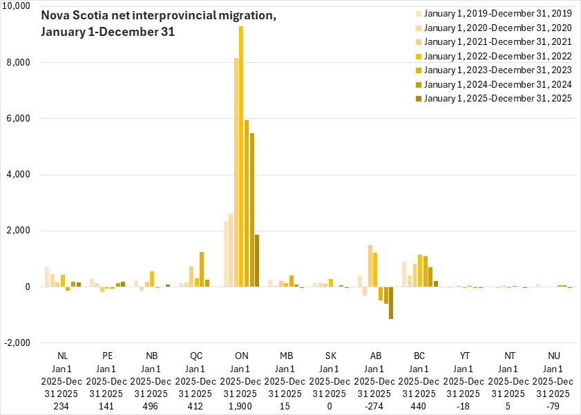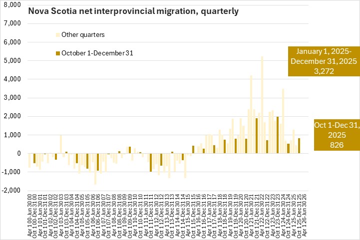 From October 1 to December 31, 2025 Nova Scotia's net interprovincial migration generated a net inflow of +826. From January 1 to December 31, 2025, Nova Scotia's net interprovincial migration was positive (+3,272). With slowing in-migration, Nova Scotia's net interprovincial migration flows have decelerated in the last two years.