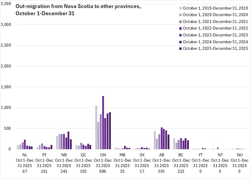 Ontario, Alberta, British Columbia and New Brunswick were the largest destinations for those leaving Nova Scotia between October 1 and December 31 of 2025. Out-migration was down compared to the same quarter in the previous year for every province except Prince Edward Island and Ontario.
