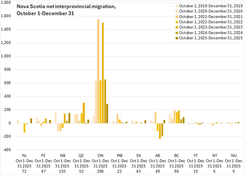 From October 1 to December 31, Nova Scotia's net interprovincial population gain reflected net inflows from every province and territory except Nunavut, with Ontario (+286) contributing the most to net interprovincial migration.