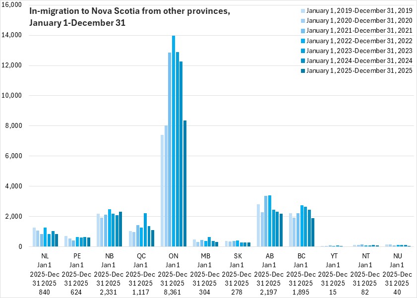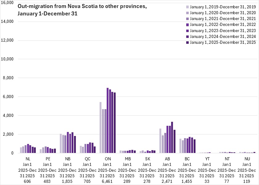 From January 1 to December 31, 2025, the primary destinations for outmigration from Nova Scotia were Ontario, Alberta and New Brunswick. Compared to the previous year, Nova Scotia out-migration decreased for all of the provinces and territories except Prince Edward Island, Yukon and Nunavut.