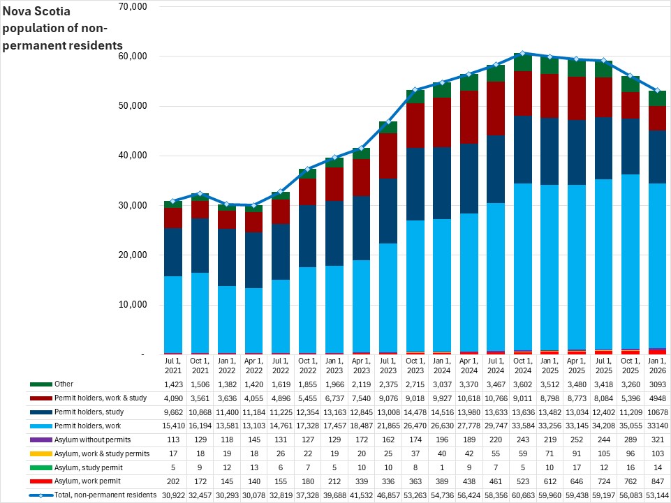 The number of non-permanent residents in Nova Scotia was 53,144 as of January 1, 2026. This was down 2,939 from October 1, 2025 and down 7,519 from the peak population of non-permanent residents on October 1, 2024 (60,663). Non-permanent residents most often hold work permits (33,140), study permits (10,678), or both work and study permits (4,948). The largest declines in the last quarter were among those holding study permits and work permits.