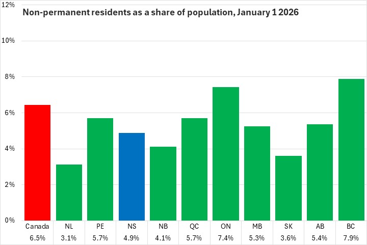 Non-permanent residents accounted for 4.9% of Nova Scotia's population as of January 1, 2026. Nationally, non-permanent residents make up 6.5% of the population with the highest shares in British Columbia (7.9%) and Ontario (7.4%) and lowest shares in Newfoundland and Labrador (3.1%) and Saskatchewan (3.6%).
