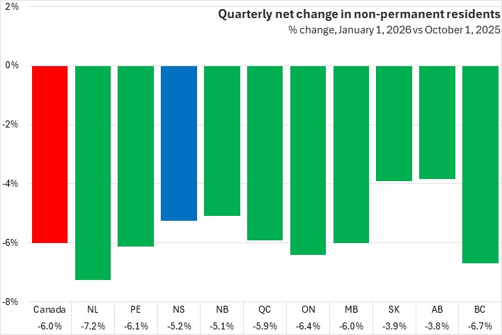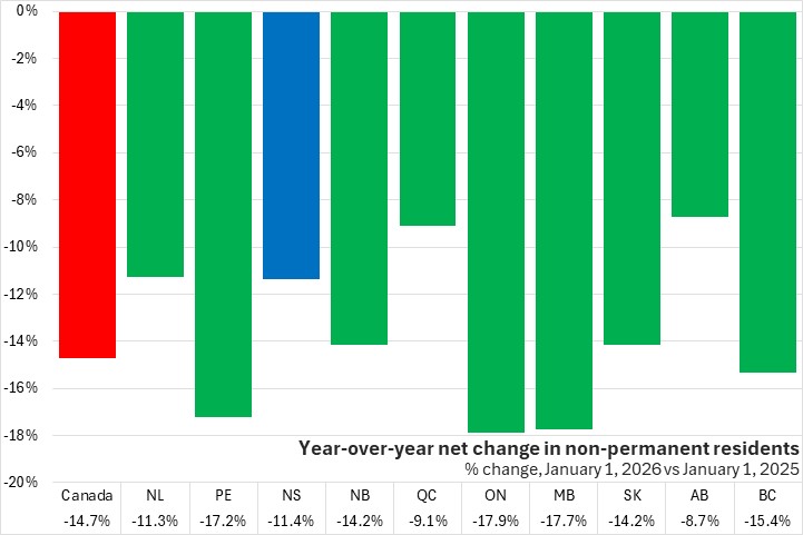 For the period October 1 to December 31, 2025 the non-permanent resident population in Nova Scotia fell 5.2%. Nationally, the non-permanent resident population was down 6.0% with declines in all provinces. Newfoundland and Labrador and British Columbia reported the steepest declines in non-permanent residents. Saskatchewan and Alberta reported the slowest declines.