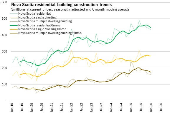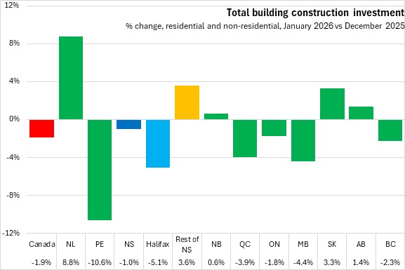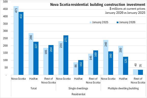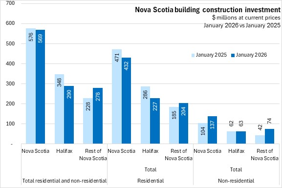 Nova Scotia's total building construction investment decreased from $576 million in January 2025 to $569 million in January 2026. Lower residential investment in Halifax was partially offset by higher residential investment outside of the city, as well as increased non-residential investment across the province.