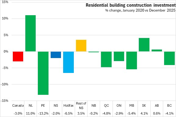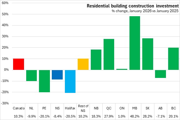 Residential construction investment was down 8.4% in Nova Scotia compared to January 2025. Halifax's residential construction was down 20.5% and outside of Halifax residential construction was up 10.2%. National residential construction was up 10.3% with gains in six provinces. Manitoba reported the fastest gain, while Prince Edward Island experienced the steepest decline.
