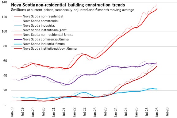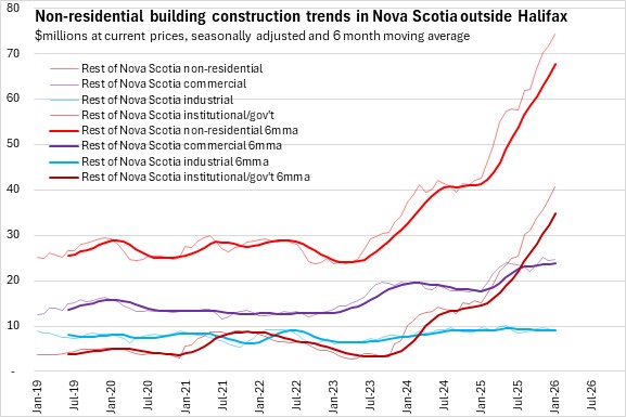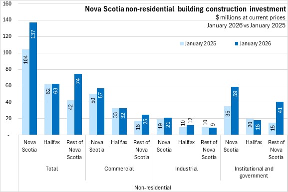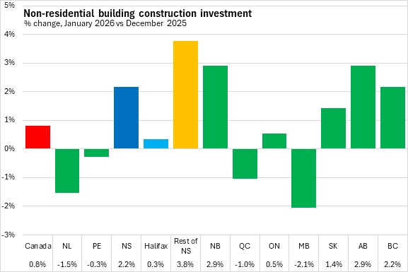 Nova Scotia's non-residential building construction grew 2.2% to $137.0 million. In Halifax, non-residential construction grew 0.3% to $62.6 million. Outside of Halifax, non-residential construction was up 3.8% to $74.3 million. National non-residential building construction grew 0.8% in January 2026 with increases in six provinces. New Brunswick and Alberta reported the largest gains while Manitoba reported the steepest decline.
