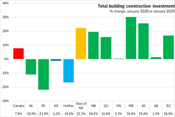 Compared to January 2025, building construction investment was down 1.2% in Nova Scotia. Halifax construction activity was down 16.6% and outside of Halifax construction activity was up 22.3%. National building construction investment was up 7.8%, with gains in seven provinces. The fastest growth was reported in Manitoba while Prince Edward Island reported the fastest decline.