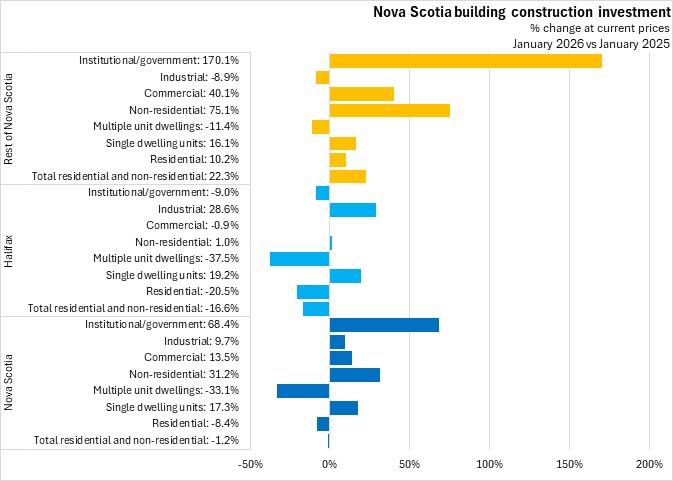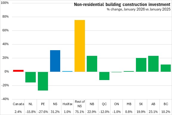 Nova Scotia's non-residential construction was up 31.2% compared to January 2025, the fastest gain among provinces. Halifax's non-residential construction rose 1.0% while outside of Halifax, non-residential construction was up 75.1%. National non-residential construction investment increased 2.4% compared to January 2025, with gains in six provinces. Prince Edward Island reported the steepest decline.