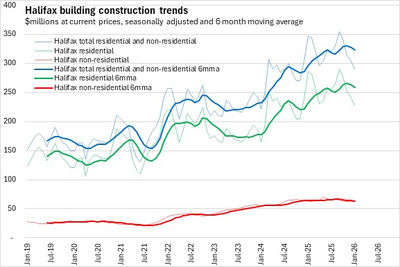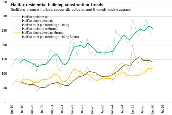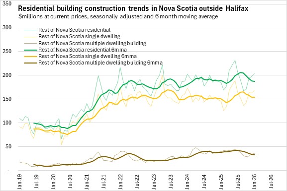 In Halifax, residential construction investment had trended up for multi-unit dwellings from late 2024 to the summer of 2025, when it peaked. Single unit dwelling investments have been on a rising trend since summer 2025. Outside of Halifax, single unit dwelling investment rose through the first half of 2025 and has declined in recent months. In Halifax, multiple dwelling unit buildings are a larger share of investment than single dwelling units in Halifax, while the opposite is true outside of the city.