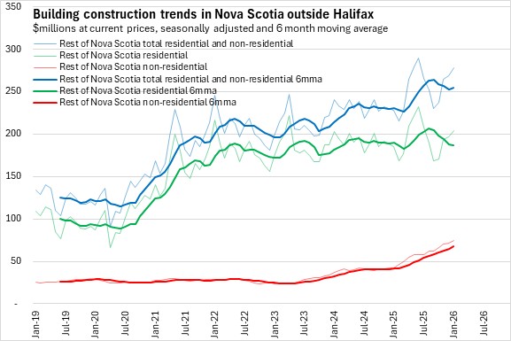 Investment in Nova Scotia building construction declined 1.0% in January 2026 to $568.5 million. Halifax monthly building construction was down 5.1% to $290.1 million while outside of Halifax building construction was up 3.6% to $278.4 million. Nationally, investment in building construction declined 1.9% with declines in six provinces. Prince Edward Island reported the fastest decline in building construction investment, while Newfoundland and Labrador reported the fastest gain.