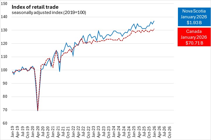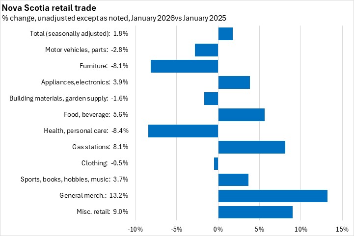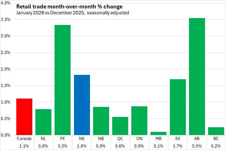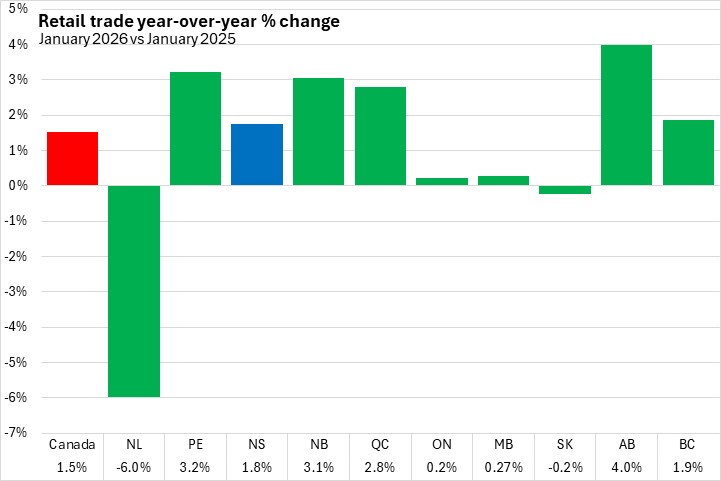 Nova Scotia retail trade increased 1.8% in January compared to the same month last year. Nationally, retail trade increased 1.5% year-over-year. Eight provinces reported year-over-year increases in retail trade, led by Alberta. Newfoundland and Labrador reported the steepest year-over-year decline.