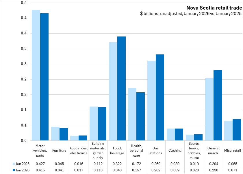 In dollar terms, motor vehicles/parts ($0.415 billion), food/beverage ($0.340 billion), gas stations ($0.282 billion) and general merchandise ($0.230 billion) contributed the most to Nova Scotia's retail sales in January 2026.