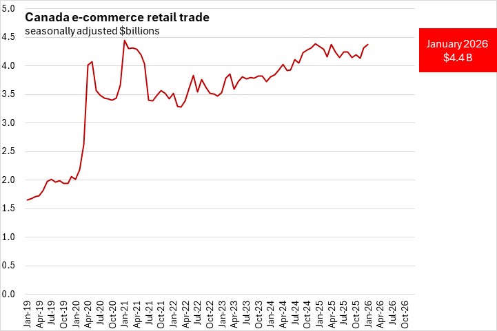 In January 2026, Canada's ecommerce sales increased 1.5% from the previous month, rising to $4.38 billion, or 6.2% of total retail sales.