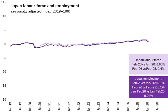 Japan's seasonally adjusted unemployment rate edged down to 2.6% in February 2026. Compared with the January, Japan's employment growth (+0.15%) outpaced labour force growth (+0.06%).