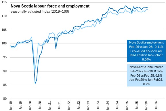 Japan's unemployment rate has been stable since 2022, as movements in labour force and employment have been very similar. During the final months of 2025, there were slight gains in both labour force and employment, followed by declines in January. In contrast, labour force and employment are more volatile in Canada and Nova Scotia. In Nova Scotia, there was modest growth in both labour force and employment in 2025 while in Canada, labour force growth outpaced employment gains.