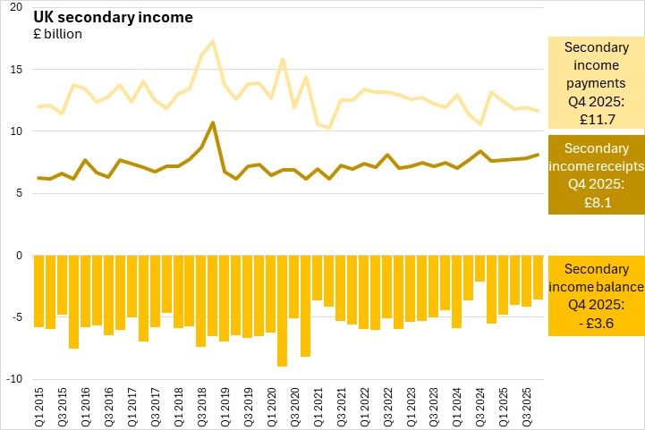 UK secondary income receipts increased by 3.4% (+£269 million) and secondary income payments decreased by 2.4% (-£289 million).