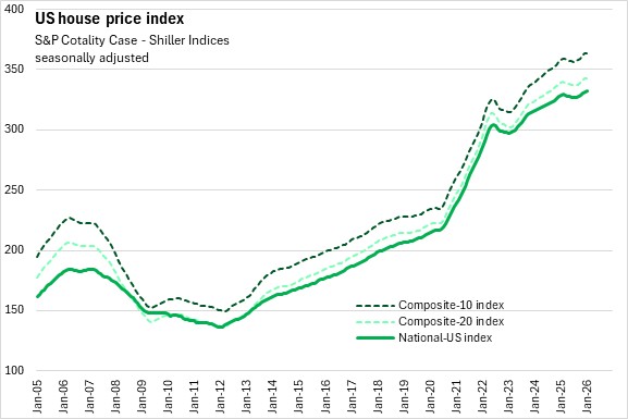 In 2023 and 2024, US house prices gradually increased and passed the peak of June 2022. In the summer months of 2025, US house prices declined, but have recently returned to a gradual increasing trend.