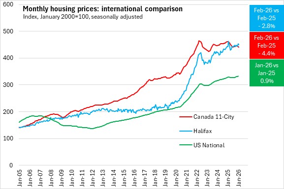 Canadian urban house price growth (measured by the Teranet-National Bank House Price Index) peaked in 2022, declined in 2023, peaked again in 2024, declined in 2025, and continue to decline in recent months (-4.4% year-over-year in February 2026). Halifax resale house prices also had peaks in 2022 and 2024, but exhibited a faster recovery over from corrections over the last 3 years.
