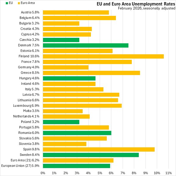 April 01, 2026EU AND EURO AREA UNEMPLOYMENT RATE, FEBRUARY 2026 Note that from 1 January 2026, the Euro Area also includes Bulgaria.