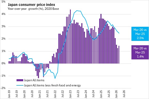 Japan’s inflation (all items, year-over-year growth in consumer price index) was 1.4% in March 2026, up from 1.3% in February. Japan's underlying inflation (all items excluding fresh food and energy) was 2.5%, down from 2.6% the previous month.