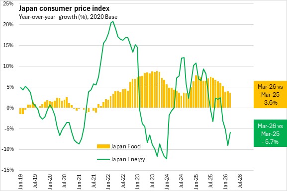 Japan's energy prices were down 5.7% in March 2026 compared with March 2025. Japan's food inflation was 3.6% over this period.