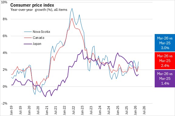 Japan's inflation was highest at the end of 2022 and the beginning of 2023, but was lower than inflation in Canada. With Canada's and Nova Scotia's inflation rates decelerating faster in 2024, inflation was higher in Japan than in Nova Scotia up until December 2025 when inflation in Japan fell below Nova Scotia and Canada and fell below the 2% target in the first three months of 2026.