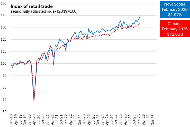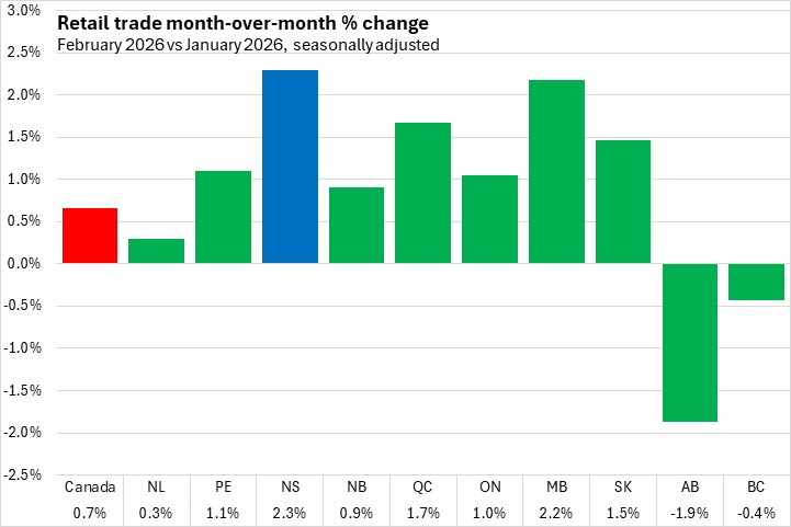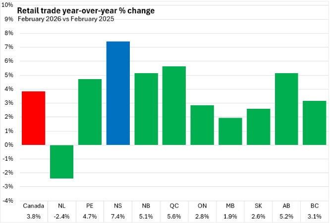 Nova Scotia retail trade increased 7.4% in February compared to the same month last year, the fastest rise among provinces. Nationally, retail trade increased 3.8% year-over-year. Every province except Newfoundland and Labrador reported increasing retail trade year-over-year.