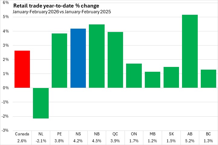 Nova Scotia retail trade increased 4.2% in January-February compared to the same period last year. Nationally, retail trade was up 2.6% year-to-date. All provinces except Newfoundland and Labrador reported year-to-date increases in retail trade. Alberta reported the fastest year-to-date growth in retail trade.