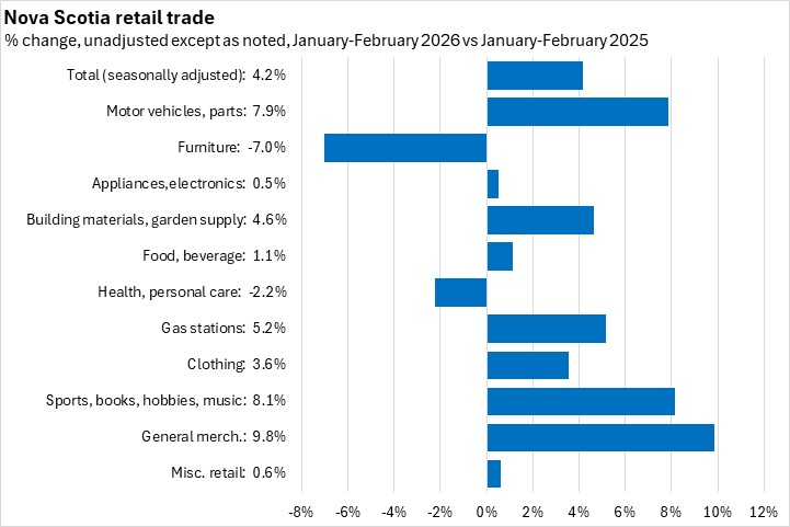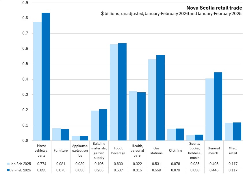 In dollar terms, motor vehicles/parts ($0.835 billion), food/beverage ($0.637 billion), gas stations ($0.559 billion) and general merchandise ($0.445 billion) contributed the most to Nova Scotia's retail sales in January-February 2026.