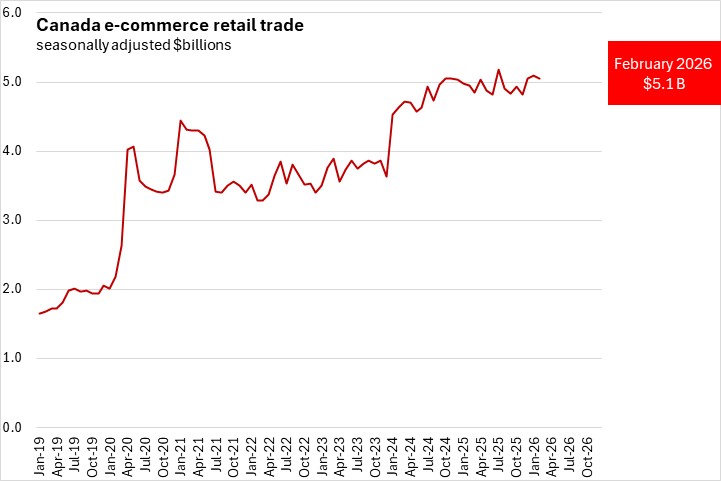 In February 2026, Canada's ecommerce sales declined 0.6% from the previous month, falling to $5.06 billion, or 7.0% of total retail sales.