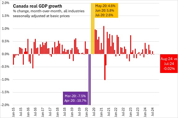 Real Gross Domestic Product (GDP) in Canada edged down 0.02% in August following a revised 0.12% growth in July 2024.
