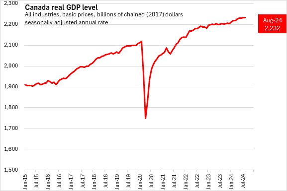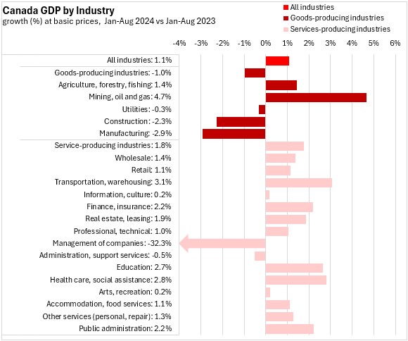 The Canadian economy was 1.1% larger in January-August 2024 when compared to the same period of 2023.