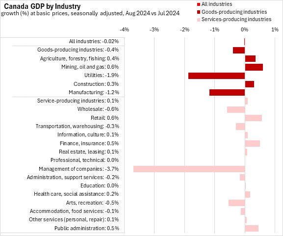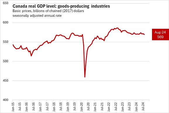 Real GDP in Canada's goods producing industries was down 0.4% from July to August 2024.