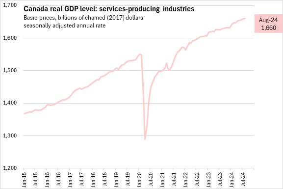 Real GDP in Canada's services-producing industries was up 0.1% from July to August 2024.
