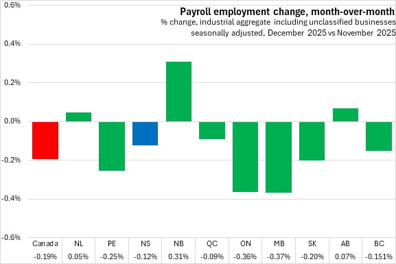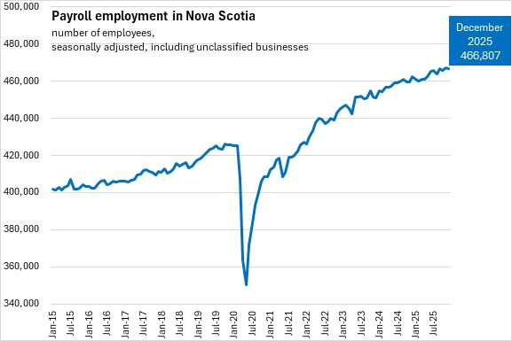 Nova Scotia had 466,807 payroll employees in December 2025, down 0.12% (-567) compared to November 2025. Canada had 18.24 million employees, down 0.19% from November 2025 with declines in seven provinces. The fastest declines were reported in Manitoba and Ontario. The largest gain was reported in New Brunswick.