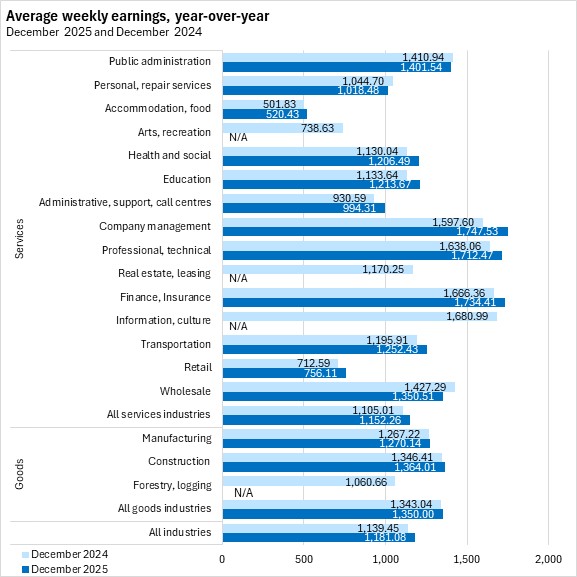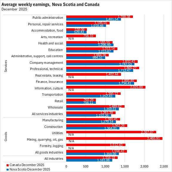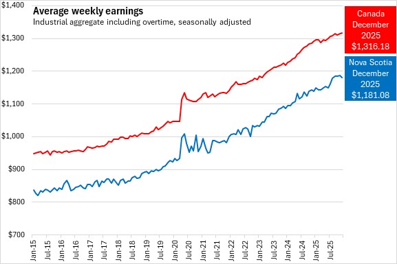 Nova Scotians' average weekly earnings were $1,181.08 in December 2025, a decline of $5.38 (-0.45%) from November 2025.