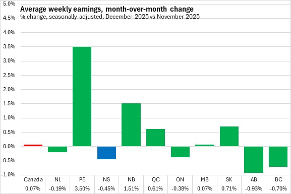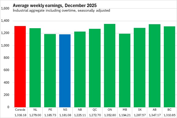 Nova Scotia's average weekly earnings in December 2025 were the lowest among provinces. Alberta and Ontario reported the highest average weekly earnings.