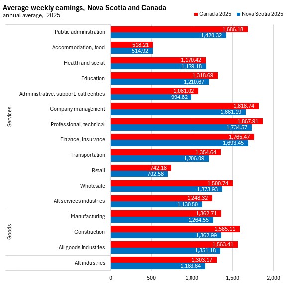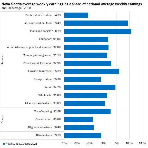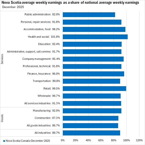 In December 2025, Nova Scotia's average weekly wages were 89.7% of the national average. Nova Scotia average weekly wages were below the comparable national average for every industry except health/social assistance. The smallest gap was reported in retail trade (99.5% of the national average). The largest gap was reported in public administration (82.0% of the national average).