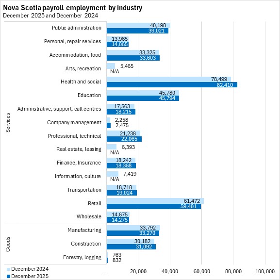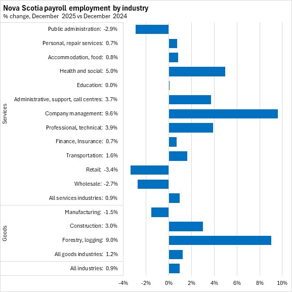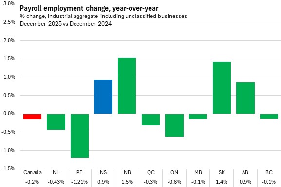 Compared with the same month in 2024, Nova Scotia's payroll employment increased by 0.9% (+4,312) in December 2025. Nationally, payroll employment decreased 0.2%, with declines in six provinces. The fastest decline was reported in Prince Edward Island while the largest gains were reported in New Brunswick and Saskatchewan.